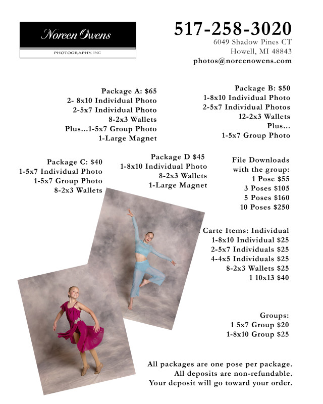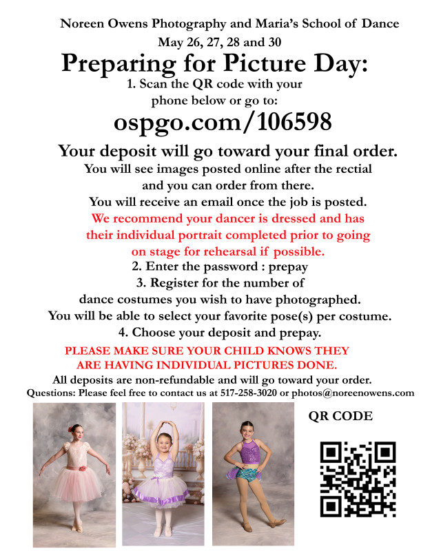RECITAL PICTURES (Preparing for Picture Day) (Price List): Both group and individual picture will be taken at dress rehearsal. Order forms will be emailed to all families. Any dancer may have individual pictures taken at any point during dress rehearsal picture time. They can come early and have all costumes done back to back or do their individual pictures before their group dance. It is highly recommended having individual pictures done before going on stage for dress rehearsal. Please allow extra time for this.